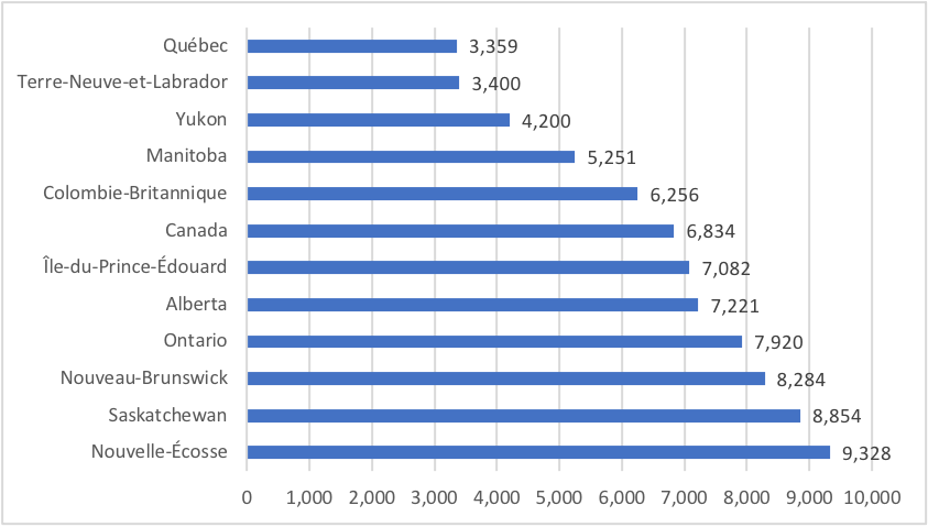 Les études universitaires coûtent beaucoup d’argent. En 2022, Statistiques Canada estimait les droits de scolarité pour une année d’études universitaires de premier cycle à 6 834 $ en moyenne dans l’ensemble du Canada, contre 3 400 $ au Québec. La figure ci-dessous montre les coûts moyens des études universitaires par province canadienne. Par conséquent, il est important de commencer à épargner tôt pour financer les études universitaires d’un enfant.