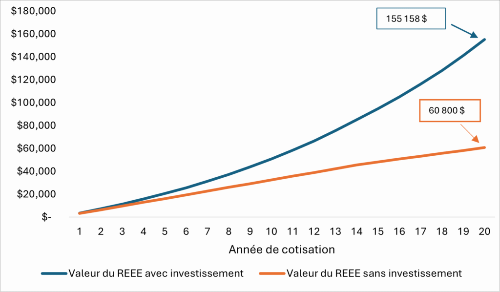 A la fin de cette vingtième année, si ces cotisations sont investies dans un FNB qui réplique la performance du marché (par exemple, prenons le S&P 500 avec un rendement en moyenne de 8 %), la valeur des fonds au sein du REEE aura atteint 155 158 $ (assumant des cotisations faites et des subventions recues au debut de chaque année).