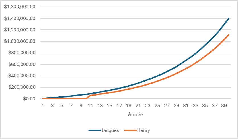 - Comme indiqué dans le graphique ci-dessous, au moment de prendre la retraite, le Jacques disposera de 200,000 $ alors qu’Henry disposera de 1,4 million de dollars.